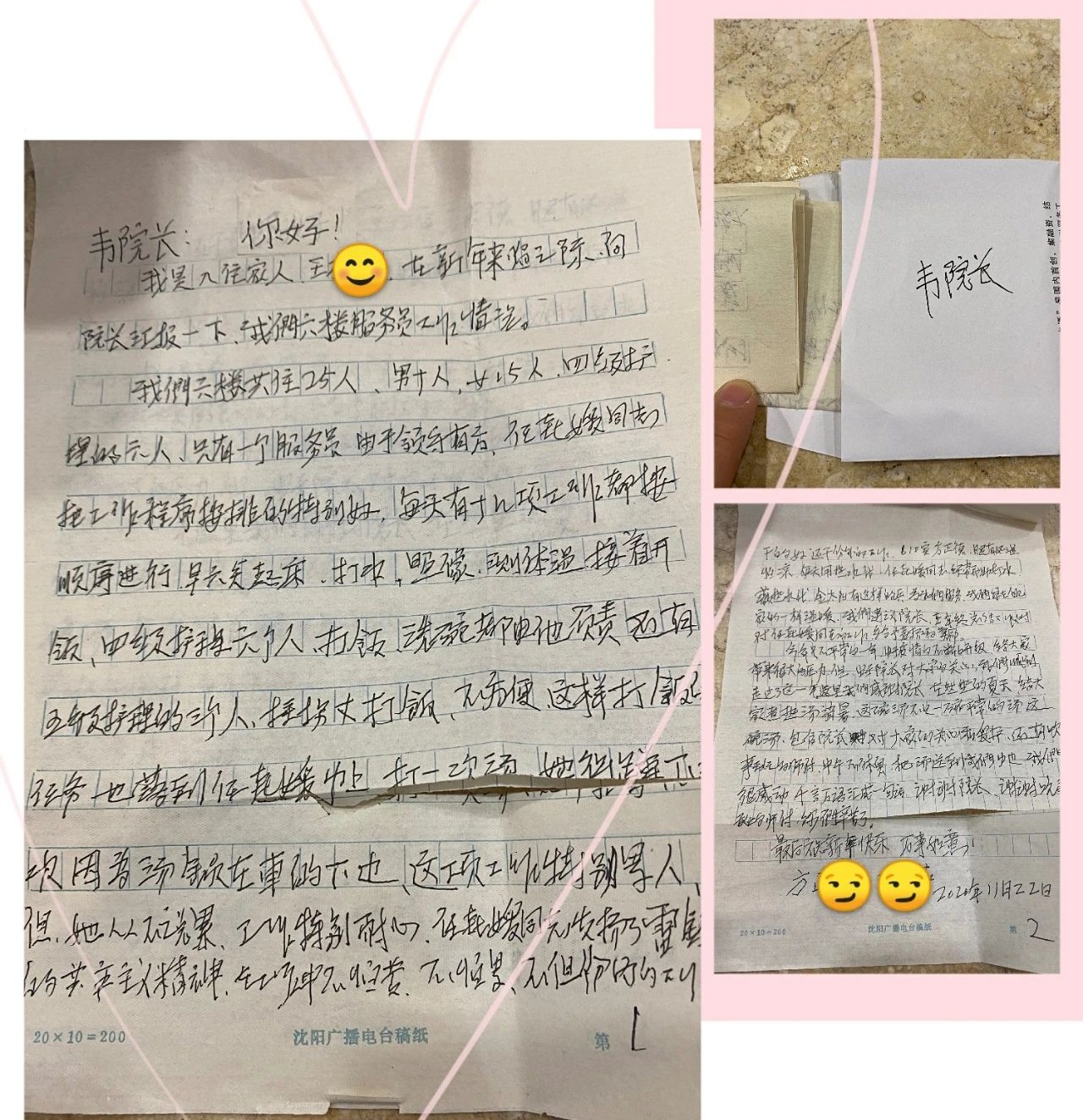你好!我是入住家人王阿姨,在新年来临之际,向院长汇报一下,我们六楼服务员工作情况。我们六楼共25人,男10人,女15人,四级护理费六人,有一个护理员,由于领导有方,任喜媛同志把护理程序安排的特别好,每天有十几项工作都按顺序进行,早六点起床、打水、照相、测体温,接着开饭,四级护理六个人,打饭、洗碗都由她负责,还有五级护理的三个人,拄拐杖打饭不方便,这样打饭的任务也落到任喜媛身上,打一次汤她也得蹲一下,因为汤放在车的下面,这项工作特别累人,但她从不说累,工作特别耐心,任喜媛同志发扬了雷锋的共产主义精神,在工作中不怕苦,不怕累,不但分内的工作干得好,还干分外的工作,610室方正德腿有风湿怕凉,每天用热水袋,任喜媛同志经常帮助打热水灌热水袋,金太阳有这样的兵为我们服务,我们像在自己家的一样温暖,我们建议院长,在年终总结工作时,对任喜媛同志的工作给予表扬;