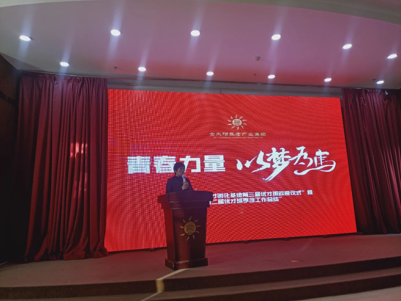 突然从学校出来走出大家的舒适区,你们必须要经历挫折,一步一步来,要明白什么该说,什么该做。像金太阳的一句话,你到底想做痛苦的狮子,还是想做快乐的猪!工作中你们该用一种极致心鞭策自己,就是工匠精神。也是金太阳的四个极致,标准极致、服务极致、细节极致、成本极致,只要你们认可金太阳的价值观,通过你们的自己的努力,就能在金太阳,甚至是整个中国的养老行业做出一番不俗的事业。